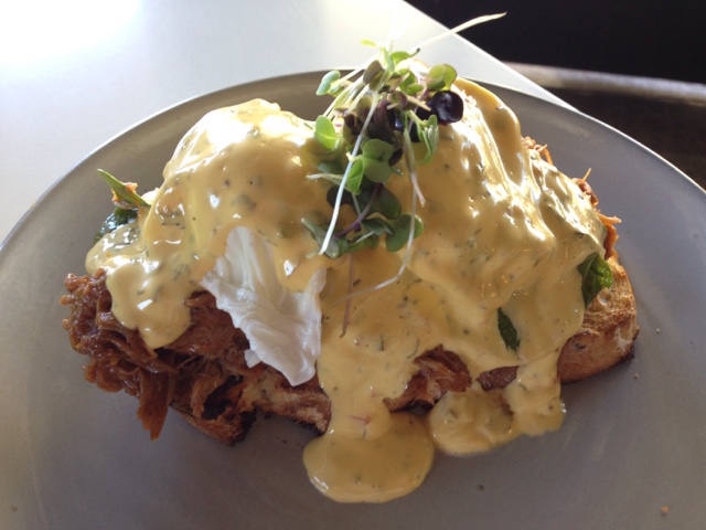 Poached eggs, pulled pork, baby spinach, artisan toast, chimichurri hollandaise-$22